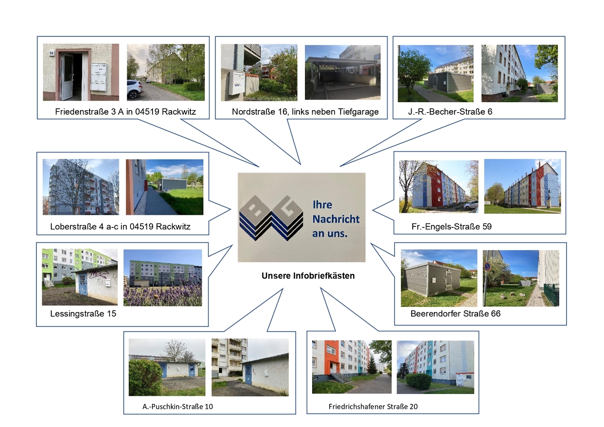 Achtung: Die WBG-Infobriefkästen werden nicht täglich geleert! Für Schreiben, die bei uns fristgerecht eingereicht werden müssen, bspw. Kündigungen, empfehlen wir den offiziellen Postweg.