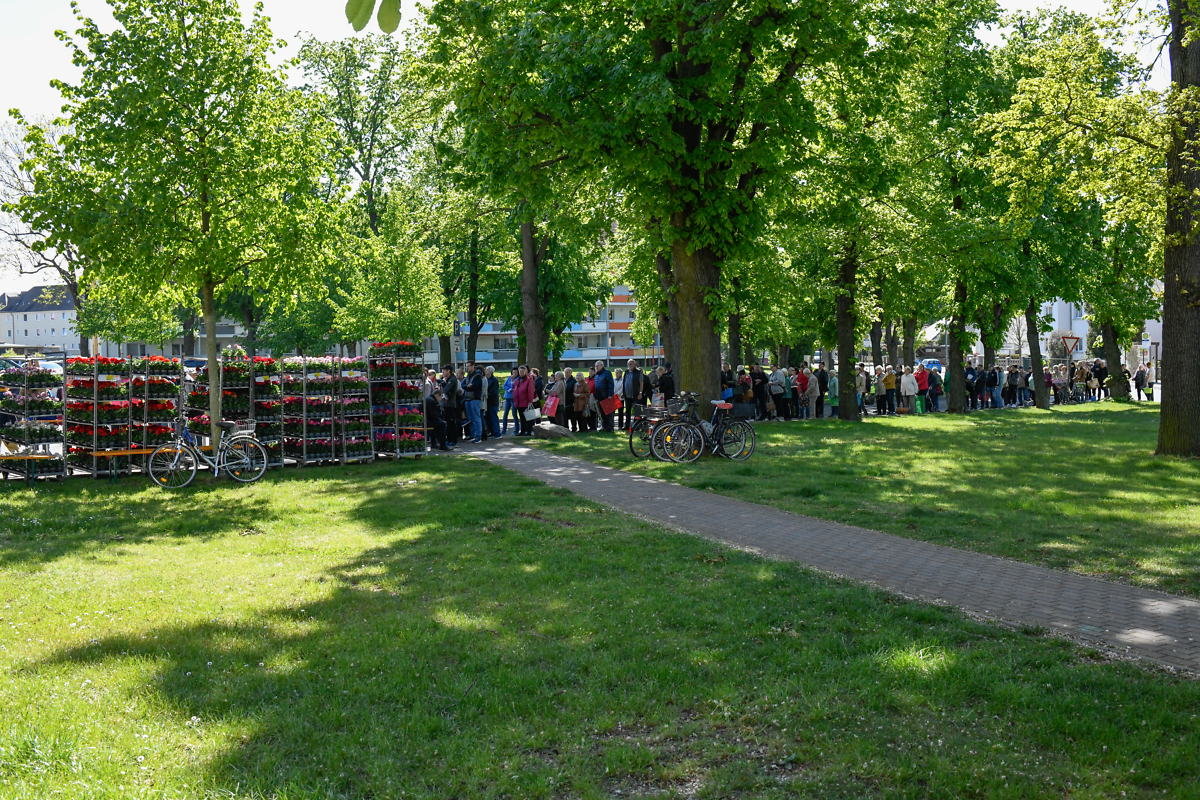 Wie in den Vorjahren auch, folgten viele Mitglieder der Einladung und so bildete sich ab 9.00 Uhr langsam eine Schlange in Richtung Securiusstraße. Alle gutgemeinten Hinweise auf die Blumenausgabezeit ab 10.30 Uhr und die Möglichkeiten auf Sitzplätze fand keinen Widerhall bei den Anstehenden.