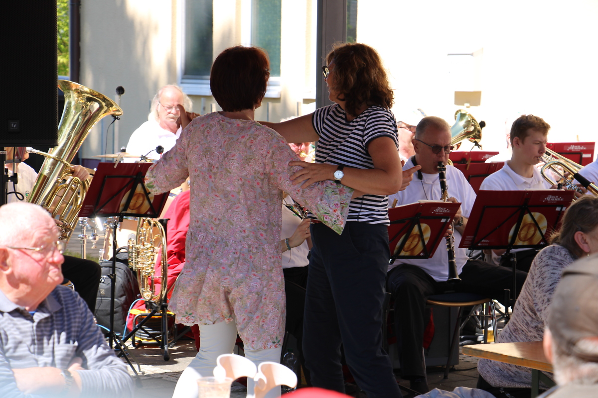 Mit dem Auftritt des Blasmusikverein Schenkenberg e.V. unter der musikalischen Leitung von Herrn Röhricht folgte ein weiteres Highlight des Tages. Die Stimmung unter den Anwesenden war ausgelassen und es wurde sogar getanzt. Der Mix aus sommerlichem Wetter, lockerer Atmosphäre, kalten Getränken und Leckeres vom Grill sorgte bei allen Beteiligten für gute Laune. Mit Freude gab der Blasmusikverein nach Ende der Spielzeit einen langen Zugaben Block. Dies wurde mit viel Beifall belohnt. Am Blumenstand kehrte langsam Ruhe ein und um 15.00 Uhr ging ein gelungenes Blumenfest zu Ende.