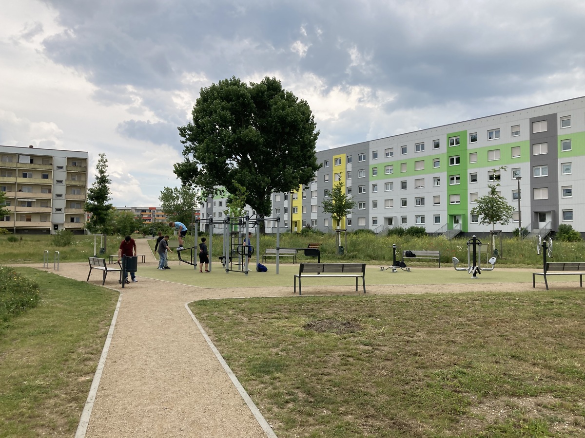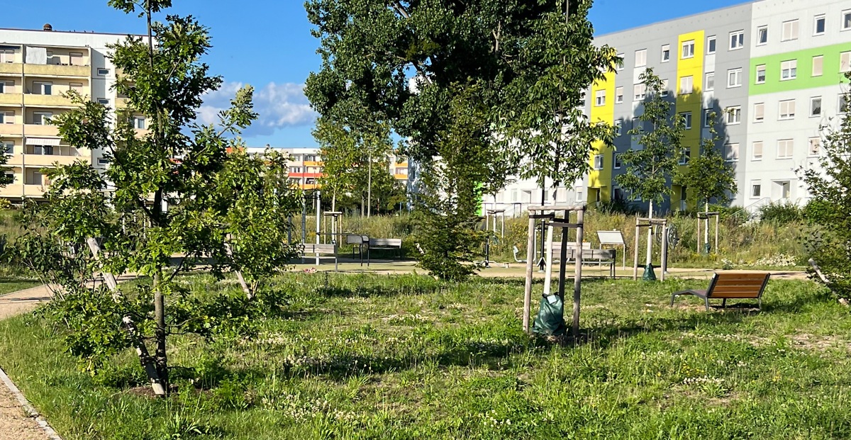 Ursprünglich standen auf dem neuen Tummelplatz der Generationen Plattenbauten. Die damalige relativ enge Bebauung brachte in Hitzesommern Nachteile mit sich.